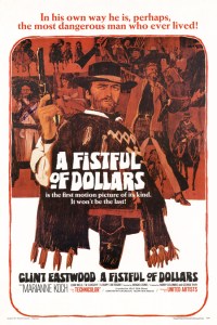 I’ve seen most of his westerns since, many more disturbing than that one, and I count them among the best. High Plains Drifter is a particular favourite, but here I’m going to focus on a movie whose poster I’ve proudly displayed on my living room wall: Fistful of Dollars.